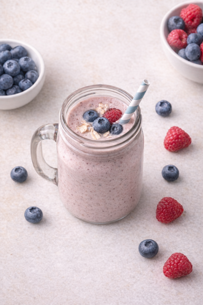 Add frozen blueberries, frozen strawberries, Greek yogurt, and protein powder to a blender.